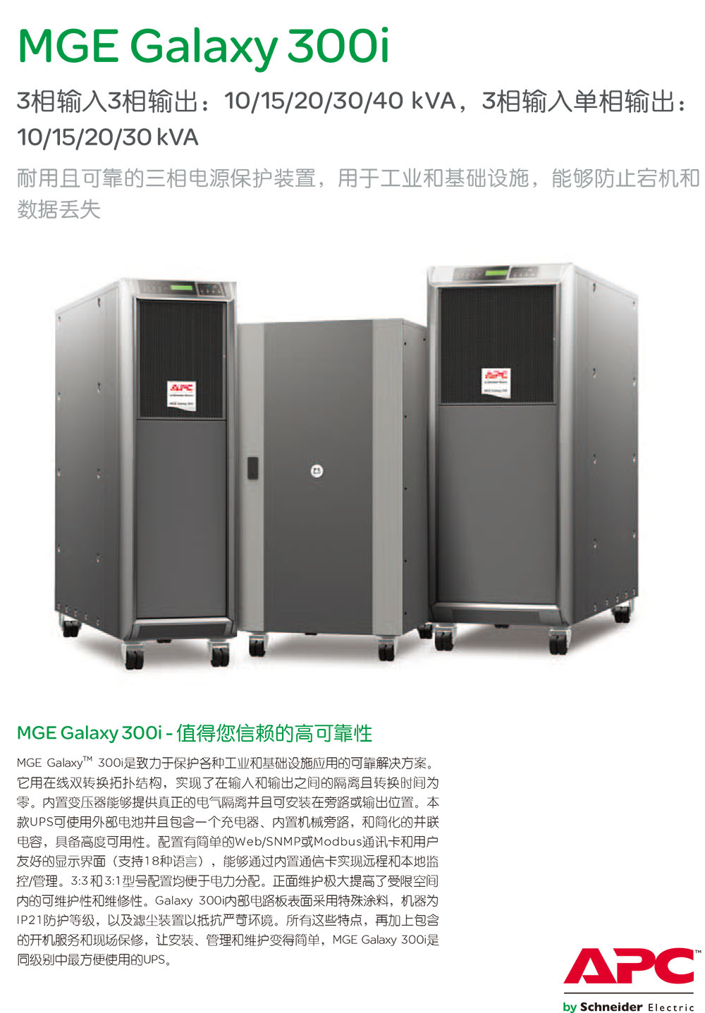 MGE Galaxy 300可為小型數(shù)據(jù)中心、商業(yè)樓宇和技術(shù)設(shè)施提供值得信賴的、可靠的電源保護(hù)。在線雙轉(zhuǎn)換拓?fù)浣Y(jié)構(gòu)能夠?qū)崿F(xiàn)輸入與輸出間的真正隔離,且轉(zhuǎn)換時間為零。運(yùn)行時間最長可達(dá)30分鐘的集成備用電池、內(nèi)部機(jī)械旁路和并聯(lián)能力可實現(xiàn)更高的可用性水平。可通過一個簡單的Web/SNMP接口和一個用戶友好型顯示界面(有14種語言可用)來實現(xiàn)遠(yuǎn)程和本地監(jiān)測/管理功能。三相轉(zhuǎn)三相(3:3)和三相轉(zhuǎn)單相(3:1)配置均可用于方便的配電。由于具有前面板接入能力而使可維護(hù)性大為提高,從而便于在有限空間內(nèi)的實施維護(hù)工作。所有